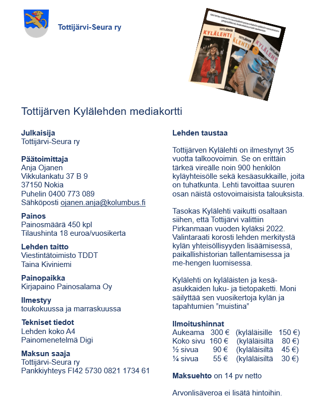 Hanki näkyvyyttä toiminnallesi mainostamalla Kylälehdessä. Samalla tuet Kylälehden toimintaa. Mainostuloilla katetaan Kylälehden painokustannuksia ja mahdollistetaan Kylälehden tekeminen.